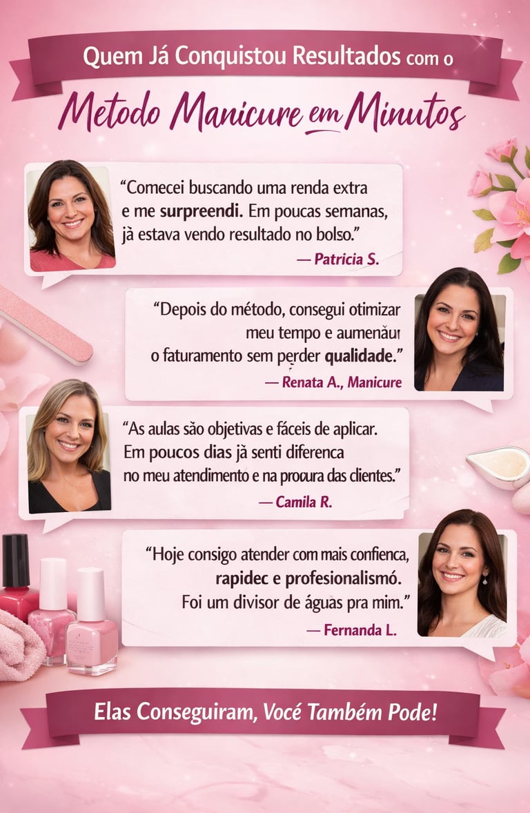 O MÉTODO MANICURE EM MINUTOS FOI CRIADO PARA SER SIMPLES, DIRETO E FACIL DE APLICAR, MESMO PARA QUEM NUNCA TRABALHOU COM UNHAS